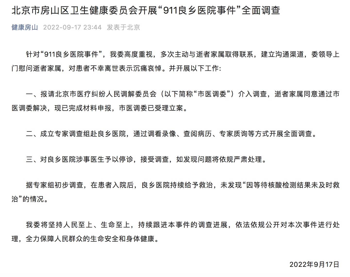 北京市房山区卫生健康委员会开展“911良乡医院事件”全面调查