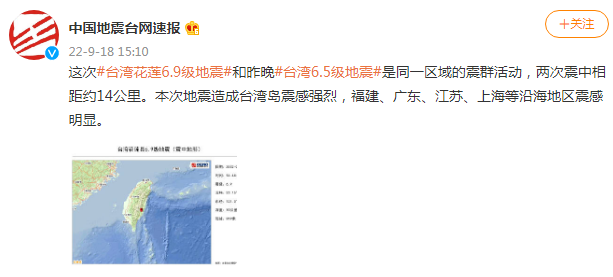 这次台湾花莲6.9级地震和昨晚台湾6.5级地震是同一区域的震群活动,两次震中相距约14公里。本次地震造成台湾岛震感强烈,福建、广东、江苏、上海等沿海地区震感明显。