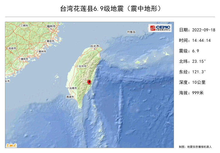 中国地震台网正式测定:09月18日14时44分在台湾花莲县(北纬23.15度,东经121.30度)发生6.9级地震,震源深度10千米。