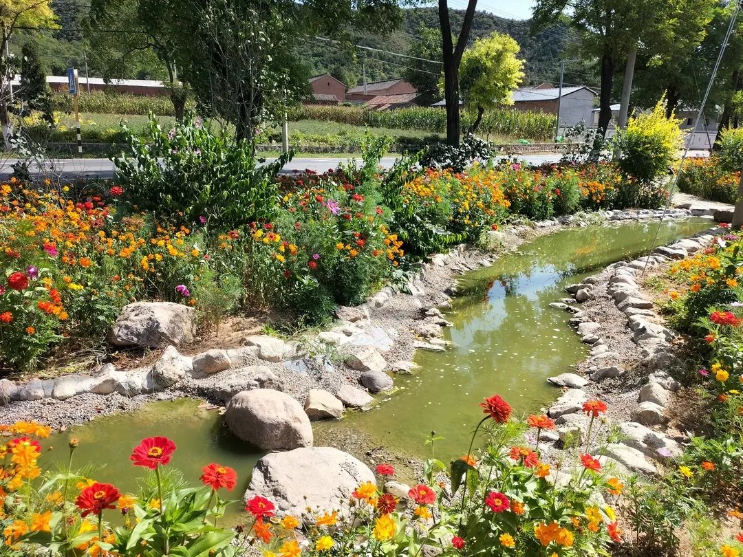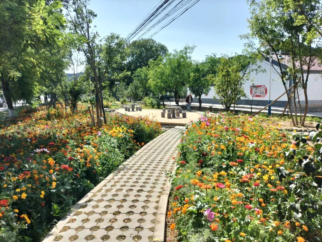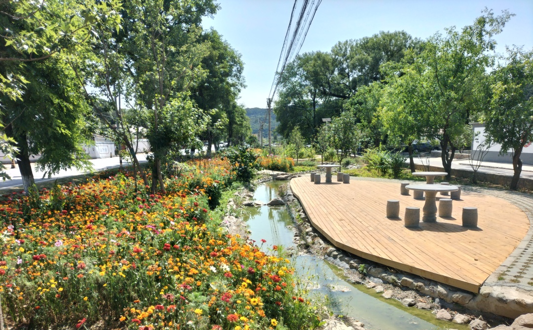 在延庆区四海镇黑汉岭村边有一处绿地公园,紧邻公路、毗邻花海景观,花草相依,溪水潺潺,座椅、亭台、绿道错落有致