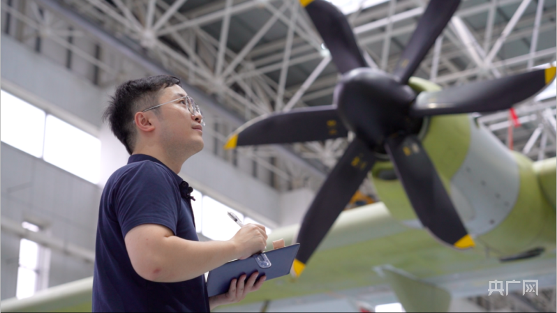 夏天骏在大型水陆两栖飞机“鲲龙”AG600总装生产线工作(央广网记者 官文清 摄)