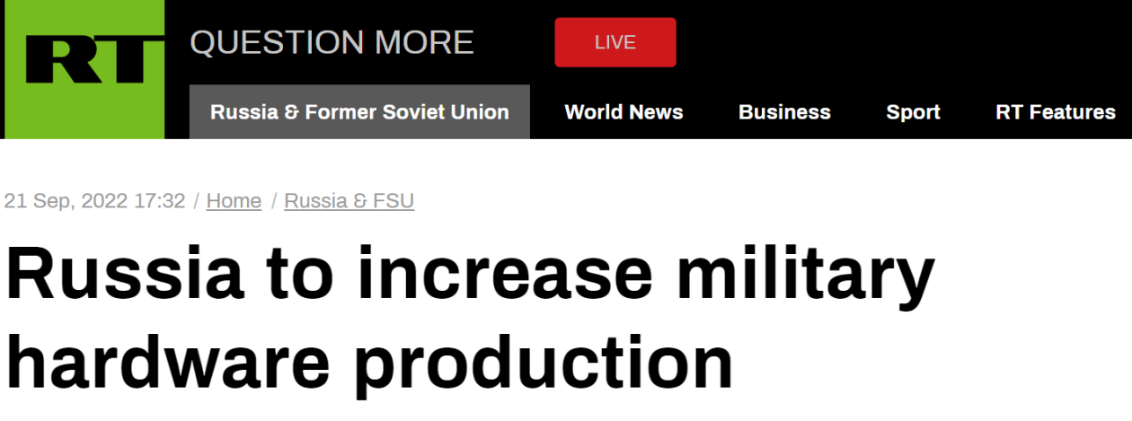 综合俄罗斯卫星通讯社、“今日俄罗斯(RT)”网站报道,俄国防和科技巨头——俄罗斯国家技术集团21日表示,鉴于俄罗斯总统普京宣布进行部分军事动员,该集团将提高军事设备的生产能力。