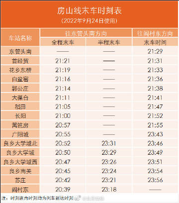②阎村东站至东管头南站(全程)末班车由22:19提前至20:39;东管头南站至阎村东站(全程)末班车由23:14提前至21:29。