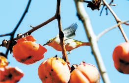 小鸟正在啄食成熟的柿子 北晚新视觉供图