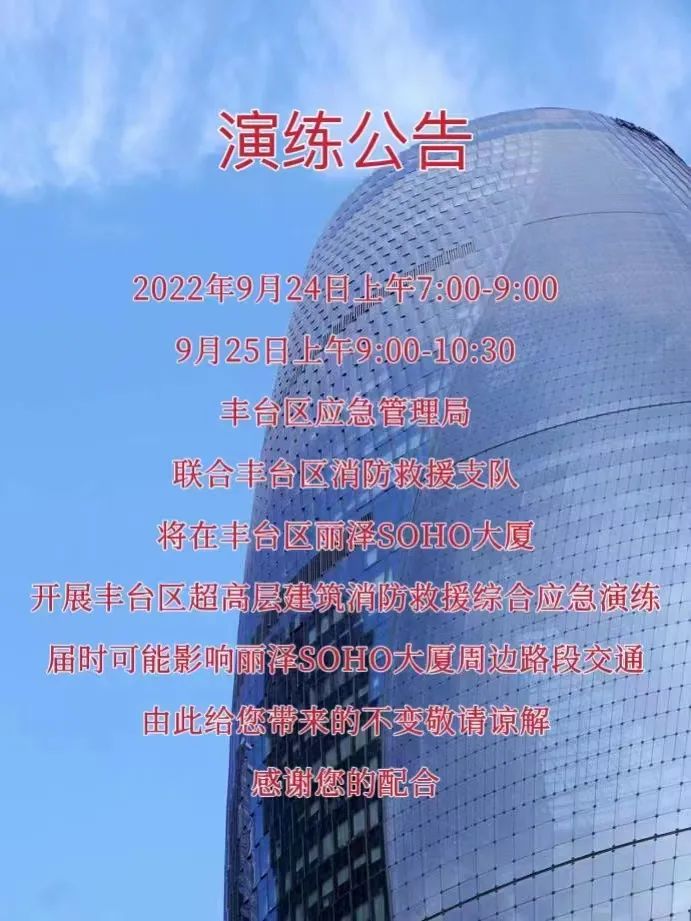 2022年9月24日上午7时至9时、9月25日上午9时至10时30分,丰台区应急管理局联合丰台区消防救援支队将在丰台区丽泽SOHO大厦开展丰台区超高层建筑消防救援综合应急演练,届时可能影响丽泽SOHO大厦周边路段的交通出行,请市民朋友们合理出行,给您带来的不变之处敬请谅解。