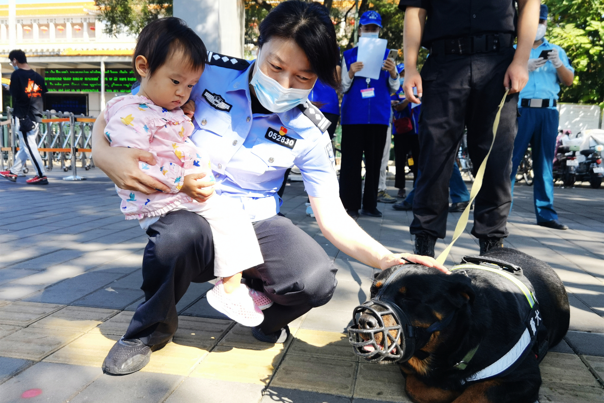 帅气的警汪们也真是操碎了心,为了公众的安全,以往担当反电诈宣传大使的它们当天变身为“防拐汪”。活动中,“黑脸儿”和“美美”在警犬训导员的带领下,积极配合民警与市民互动,卖力地展示自己的魅力,吸睛圈粉,激起了市民参加活动的兴趣。