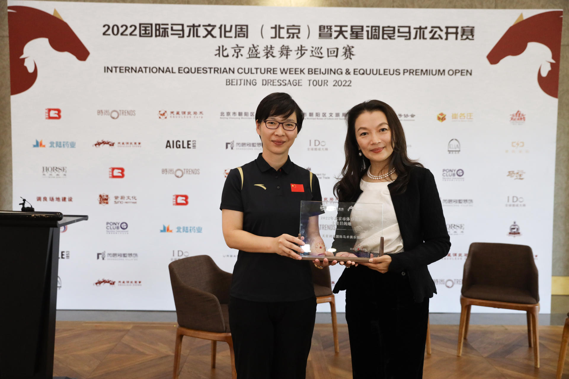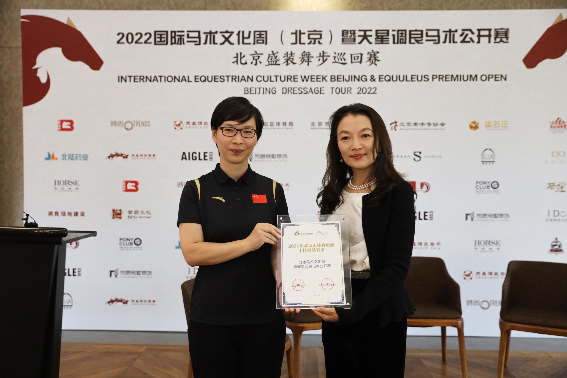 活动现场,北京市朝阳区体育局副局长刘金娟(左)为天星调良马术颁奖