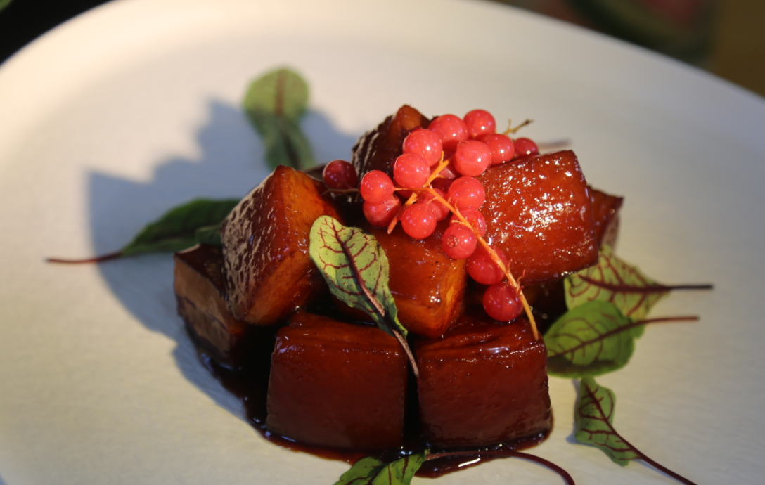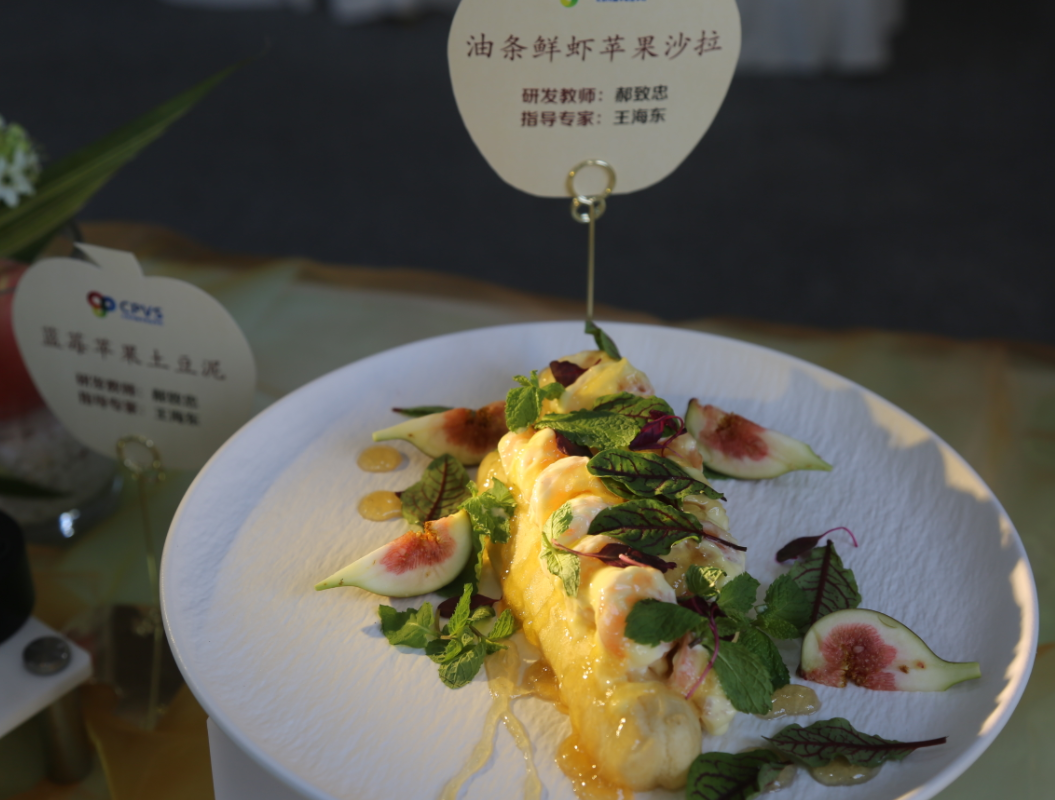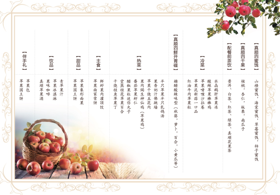 活动现场发布了崔村镇特色“苹果主题宴”,将苹果元素和文化融入26道精美菜肴。其中冷菜集中选择富士和王林两个苹果品种,包括水晶鹅肝苹果冻、酸辣苹果棒棒鸡等;热菜包括半只苹果半只鸽、果香奶汁佛跳墙、苹果干烧五花肉等;甜品类有苹果象形面果、苹果国王饼等。