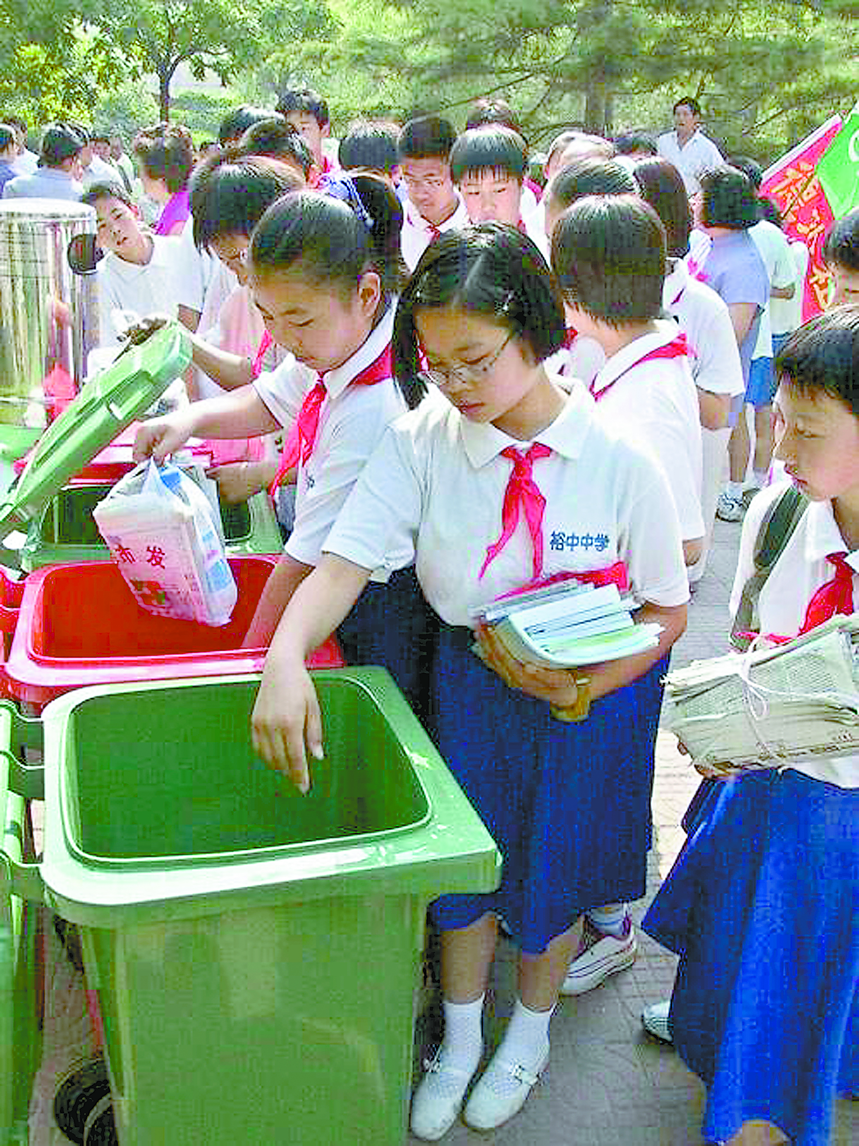 2000年,本市城区全面实行垃圾分类。图为西城区德外街道在学生中开展垃圾分类宣传。潘毅摄