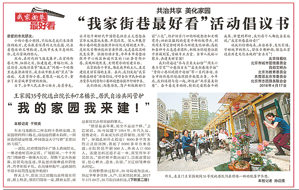 2018年,也是北京正式启动第一轮背街小巷环境整治提升的第二年,北京日报社联合市城市管理委、首都文明办、市教委、团市委、北京市志愿服务联合会共6家单位发出“我家街巷最好看”活动倡议书,呼吁全体市民和社会力量参与到背街小巷环境整治提升行动中来。倡议一出,街道、社区、市民、商户纷纷响应,积极行动起来。