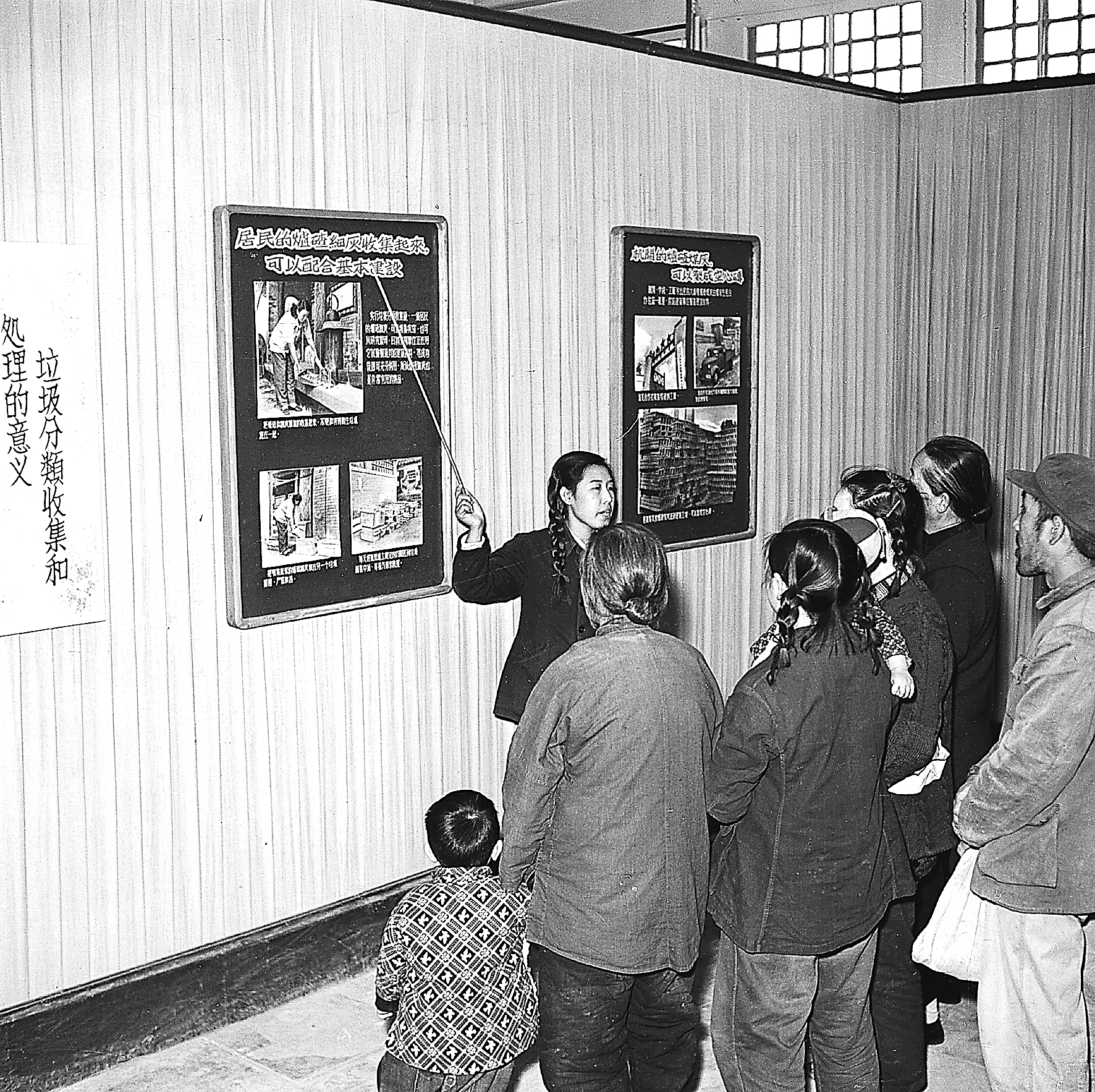 1955年,“改进环境卫生展览会”上,居民在听讲解员讲解实行垃圾分类处理的重要意义。 李祖慧摄
