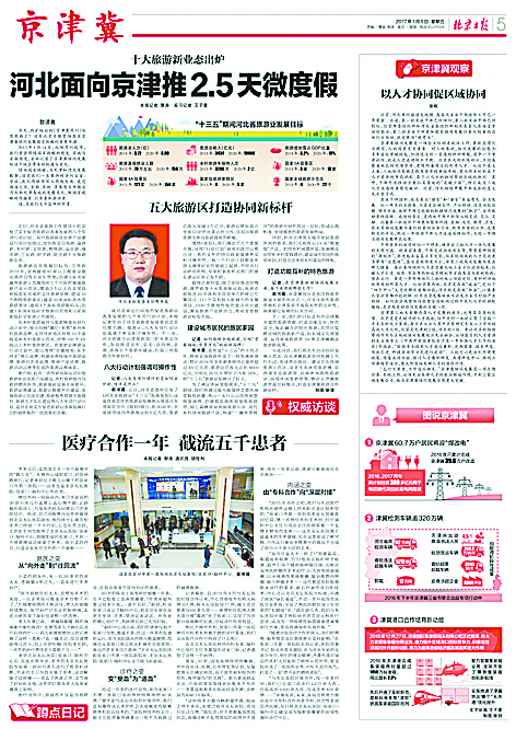 2015年3月,《京津冀协同发展规划纲要》审议通过,完成了战略的顶层设计,同时拉开了协同发展的大幕。2017年1月,改扩版后的“聚焦京津冀协同发展”周刊正式更名为“京津冀”。从2013年发轫,到2017年周刊定名,《北京日报》紧密跟随国家战略的萌发、实施与全面推进,紧紧抓住疏解非首都功能这个“牛鼻子”,全面记录了京津冀协同发展给区域带来的机遇与变化。