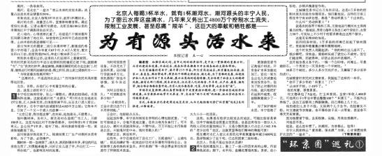 1996年10月24日,“‘环京圈’巡礼”专栏在《北京日报》头版开栏了。第一篇报道《为有源头活水来》,写的正是丰宁人民为守护密云水库这盆清水,限制工业发展,保护潮河上游生态付出的无私奉献。“为啥紧着治理潮河啊?”“这潮河水,不是流到北京么!”在这篇洋洋洒洒4000多字的长篇通讯中,王一心在文末写道:“我们‘共同’一个水源,我们共有一个家园!”