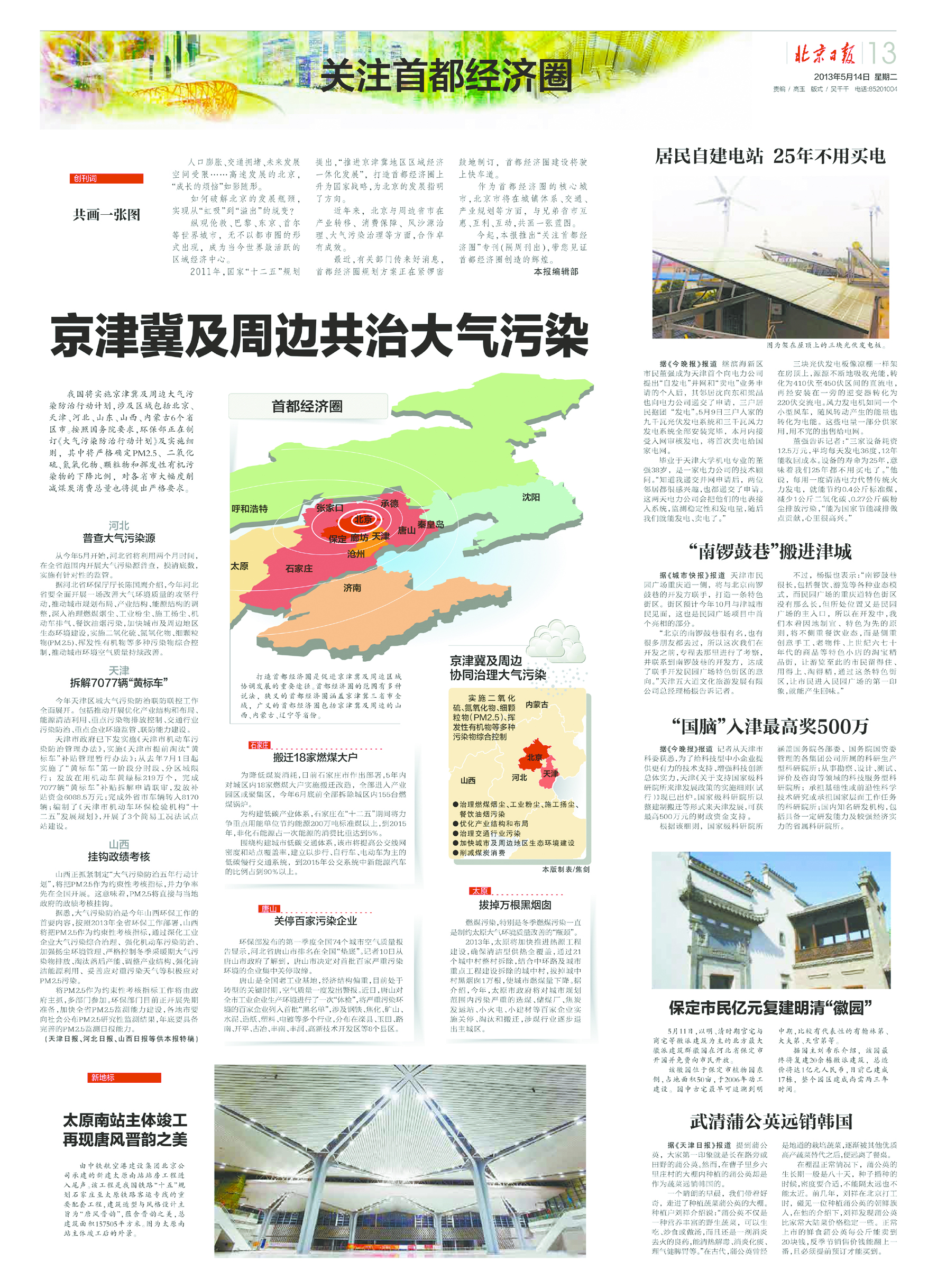 在“共画一张蓝图”的思路引领下,2013年5月14日,《北京日报》推出“关注首都经济圈”版面,以专门的版面聚焦首都经济圈建设。新专刊的开篇,就是聚焦京津冀及周边地区共治大气污染的情况。