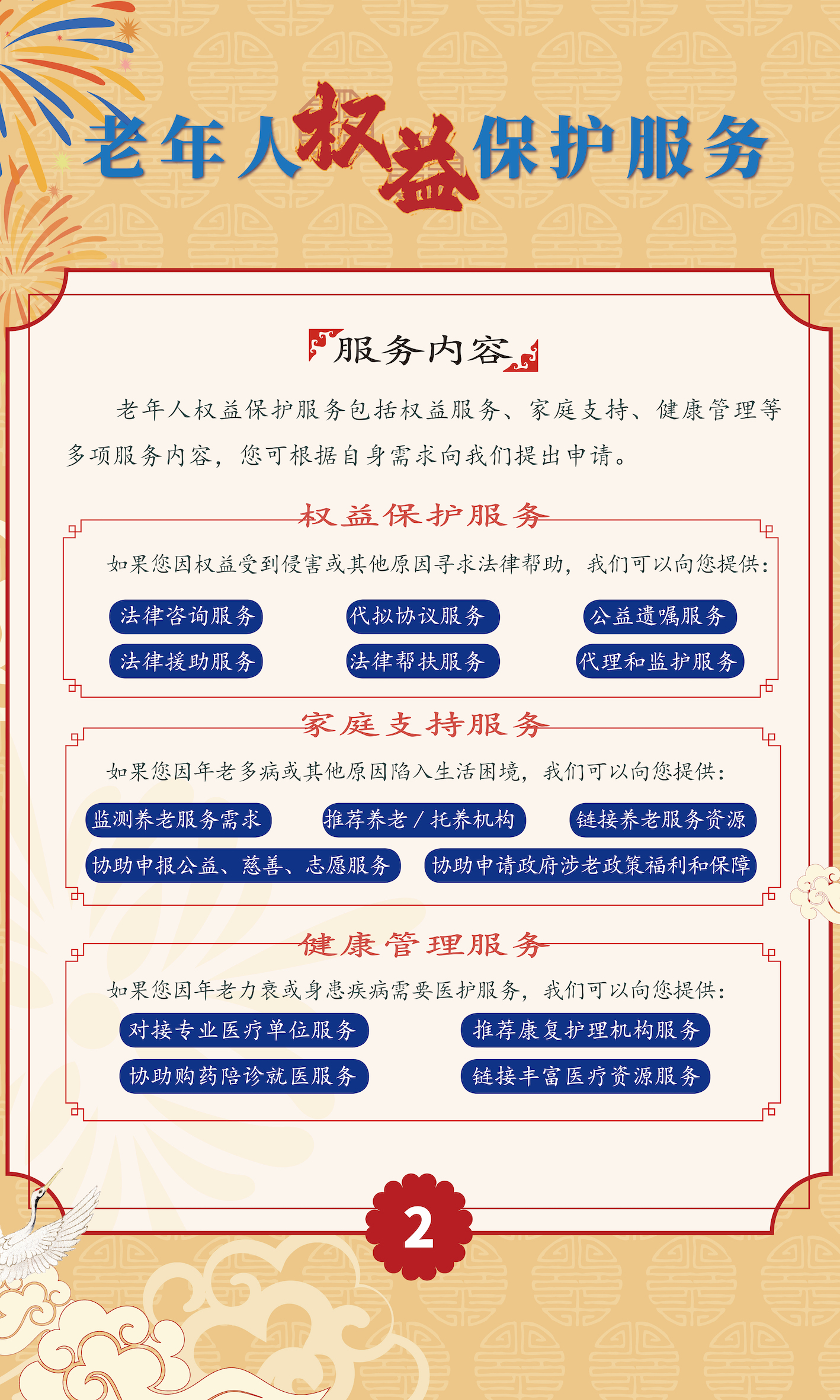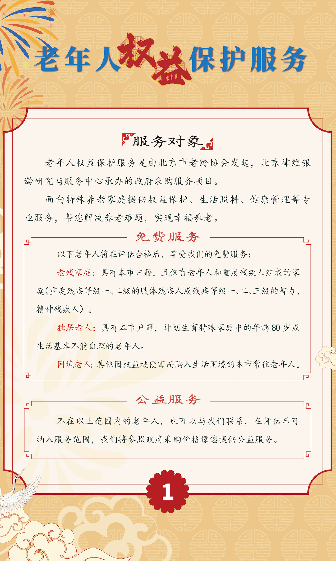 随着年龄增长,身体机能下降,老年人逐渐成为各种侵权案件的“高危人群”。北京市老龄协会发起此次公益项目,将为社区老年人“近距离”提供权益保护服务。据了解,老年人权益保护服务项目由北京律维银龄研究与服务中心承办,主要包括权益保护、家庭支持、健康管理等服务内容,服务团队采用“律师+社工师+医师”的模式为老人提供支持。如果老年人权益受到侵害,或因为其他原因寻求法律帮助,专业律师将为老年人提供法律咨询、代拟协议、公益遗嘱、法律援助、委托代理与监护等服务;如果老年人希望寻求养老方面的支持,专业的社会工作师可以为老人提供养老咨询等服务,协助老年人及其家庭申报各类政策福利和保障;而在健康管理方面,专业医师可以帮助老年人对接医疗资源,提供陪同就医等服务。