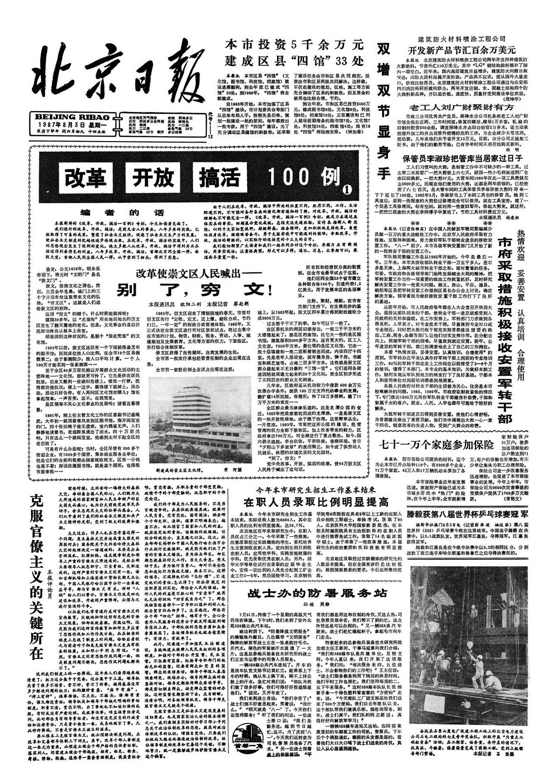 1987年8月3日1版开设“改革开放搞活100例”专栏。