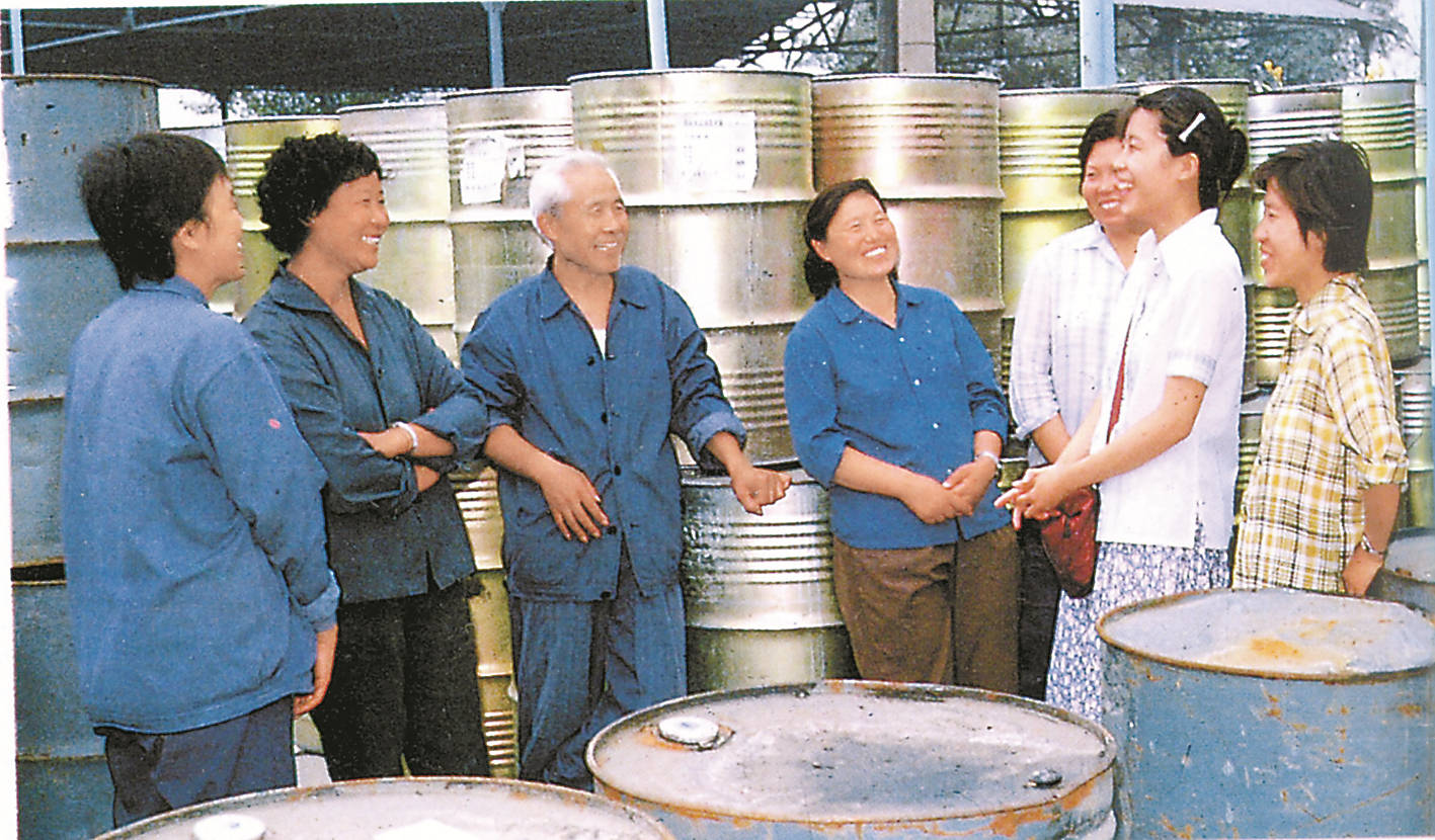 1985年,记者赵红(右二)深入企业采访。
