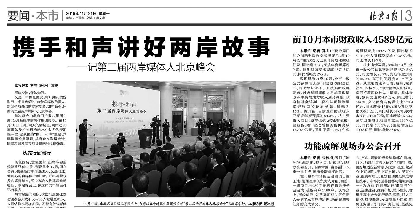 在推动两岸媒体合作交流的历史责任面前,北京日报报业集团勇于担当,全力以赴。从2015年起,京报集团携手旺旺中时媒体集团举办的“两岸媒体人北京峰会”历经四届,已成为国家级大型两岸交流活动,受到海内外社会各界关注。