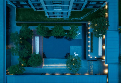 不同于千篇一律、平庸化的建筑形态,融创·东山府别墅产品,开创性地采用了“5+3”设计理念,即将边户3层合院与中间5层叠墅融为一体,同时配合向外推展出的超大露台、并运用大面积蓝色玻璃,边户合院从高往低层层错开,呈现出梯田状的排列形式,远远望去,犹如一艘停泊于山林间的“蓝水晶邮轮”,显得格外耀眼,极具辨识度。