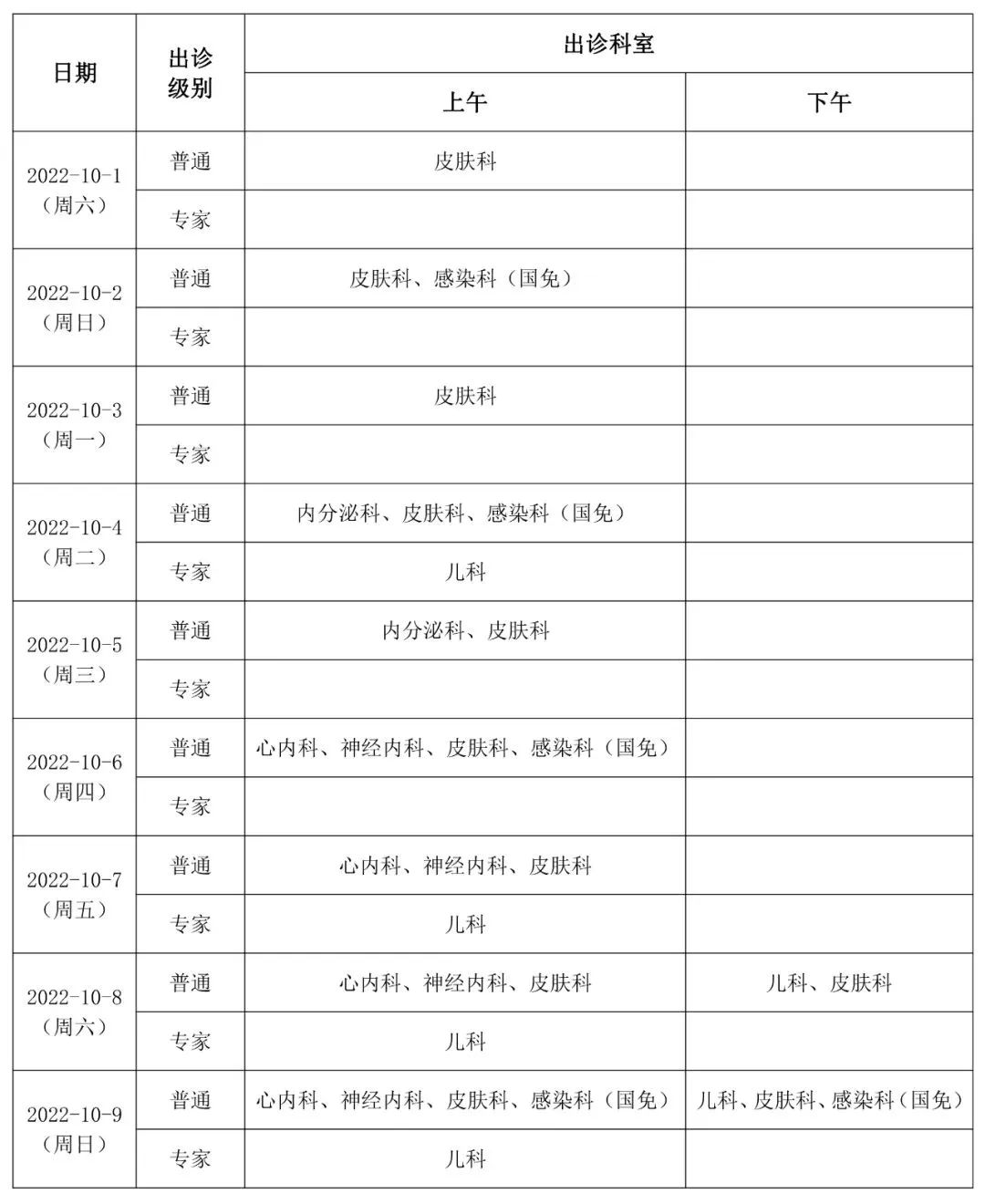 10月2日至10月7日(周日至周五):上午半日门诊,专家+普通;