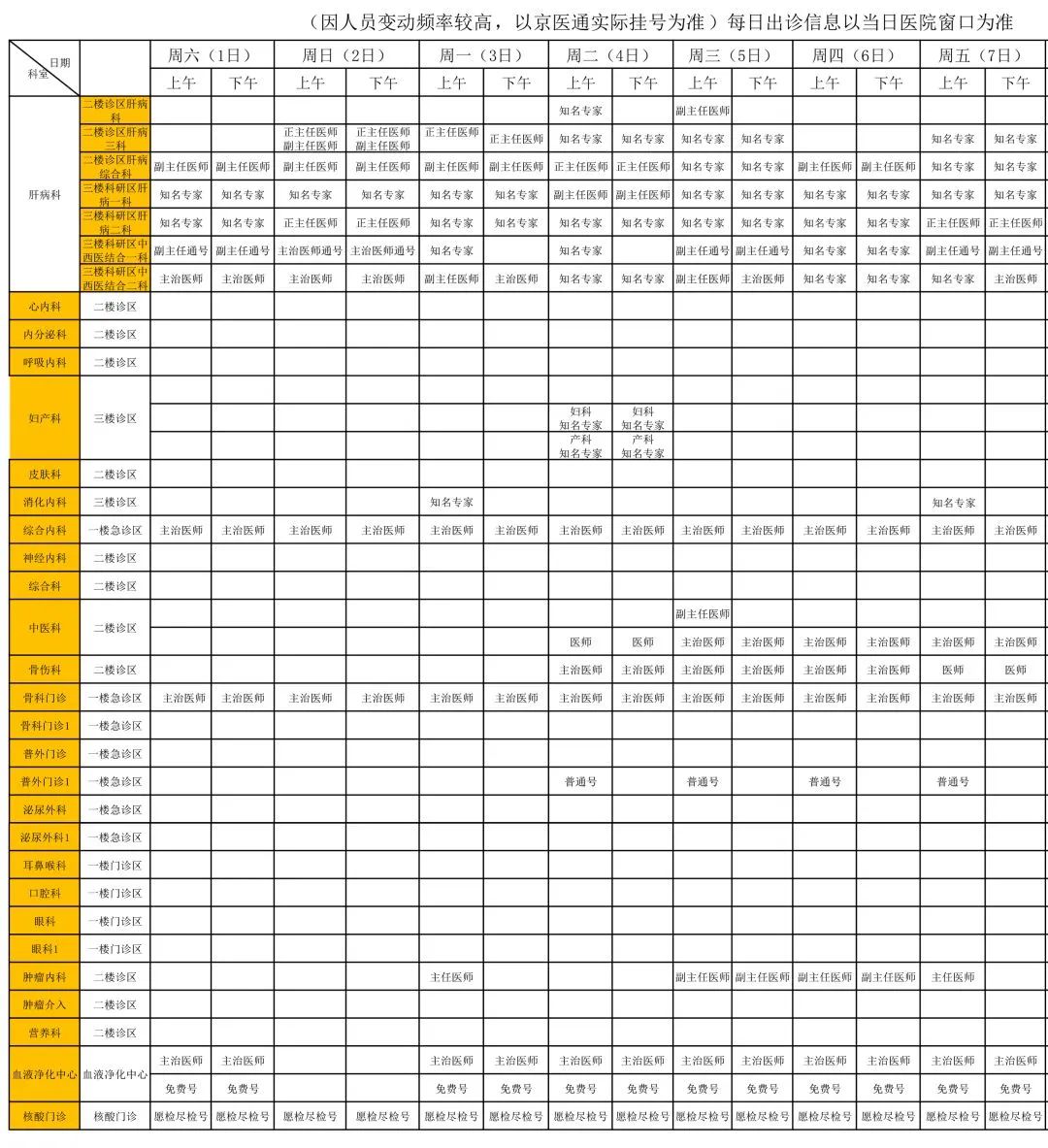 ▲免疫科、呼吸一科、呼吸二科、内分泌遗传代谢科、肾病一科、肾病二科、风湿科、血液一科、血液二科、干细胞移植科、肿瘤内科、康复科、普外科、胸外科、肿瘤外科、新生儿外科、神经外科、泌尿外科:10月3日—10月7日出诊。
