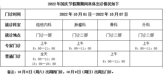 【普通外科】:10月2日上午、10月4日上午和10月6日上午有门诊,其余时间停诊。