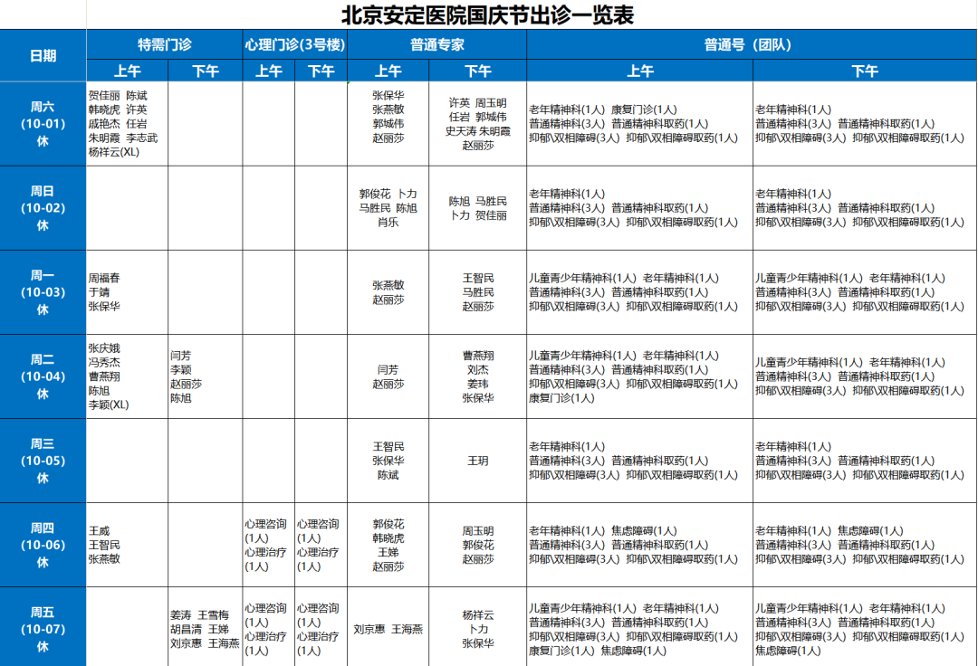 10月2日至10月7日:全日普通门诊,出节假日专家门诊;