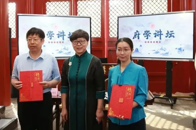滕亚杰校长为今天走上“府学讲坛”的开坛嘉宾——北京师范大学副教授姚颖,首都师范大学教育学部教授、北京市人民政府参事室特约研究员、中国教育学会传统文化教育分会理事长徐勇颁发荣誉聘书。