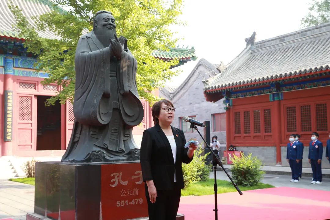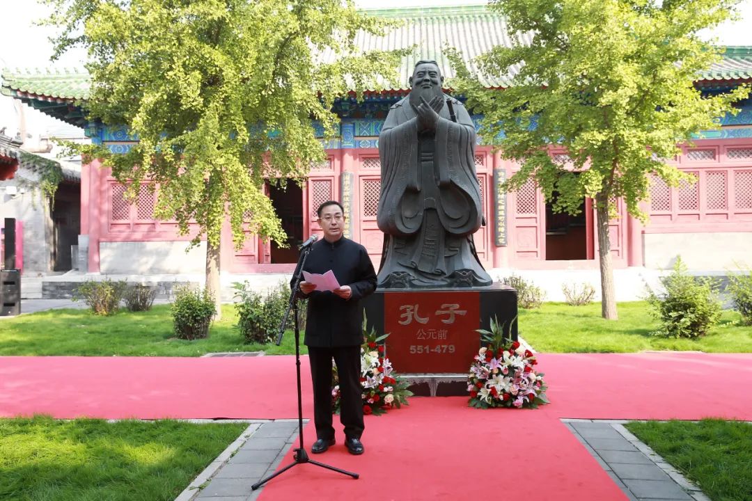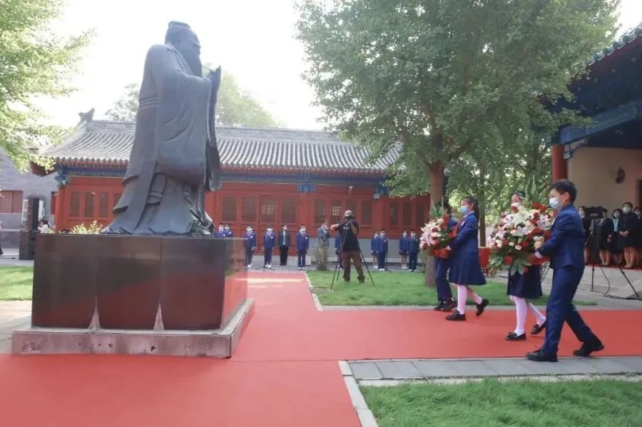国际儒学联合会特别顾问辛旗代表国际儒学联合会与师生们一道在大成殿前向至圣先师孔子奉上崇高的礼赞,转达国务院原副总理、国际儒学联合会会长刘延东对府学师生的寄语和期望,希望学校继续发扬传统,立德树人,创新发展,为培养担当民族复兴重任的时代新人作出新贡献。