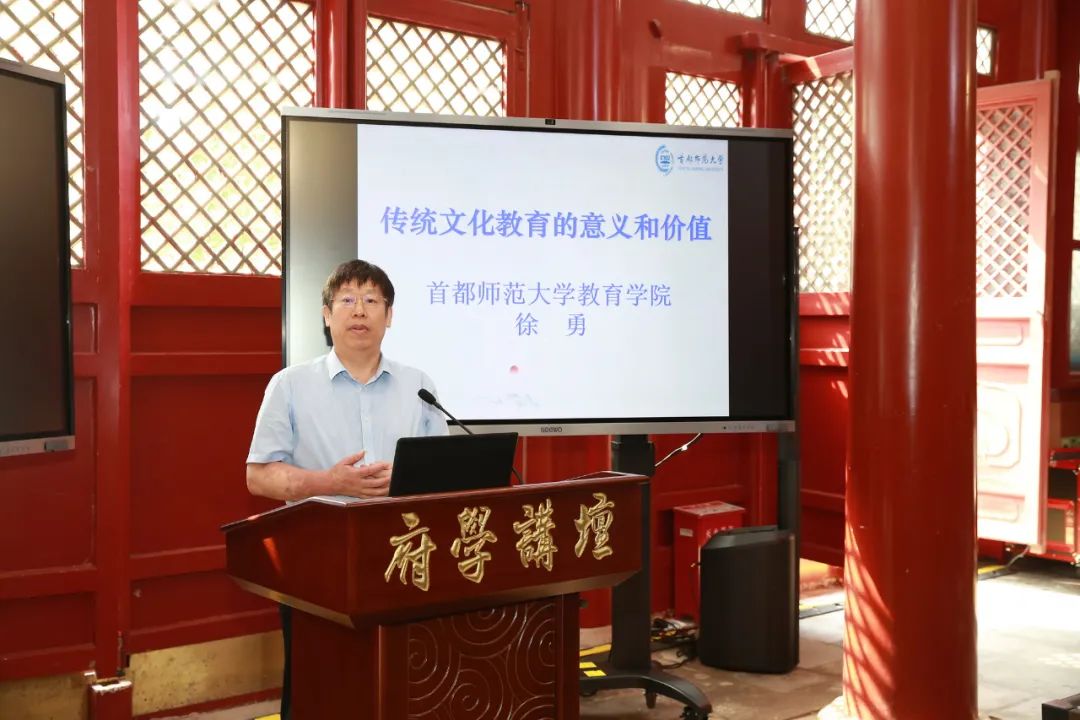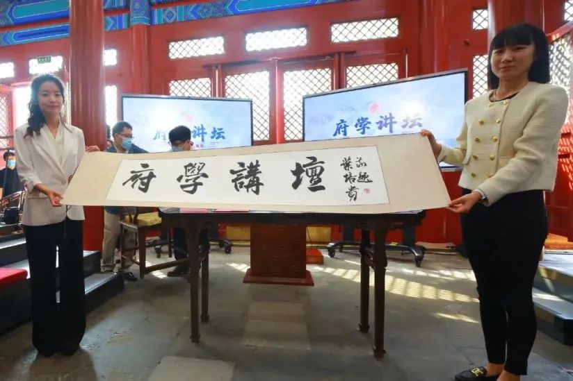 随后,与会嘉宾及师生走进府学大成殿,参加“府学讲坛”开坛仪式。北京教育学院原党委书记马宪平、北京教育宣传学会副理事长董城、北京教育科学研究院原院长时龙和《中国教育学刊》杂志社发展中心主任郭峻弛等嘉宾以及学生代表一起轻触电子屏幕上的门环,“府学讲坛”正式开启。滕亚杰校长致开坛词,表示将以府学讲坛启智润心、培根铸魂,聚文化的力量,筑府学精神长城,锻造府学品牌之大业,绘就“奋进府学”的新图景,努力造就堪当时代重任的接班人。
