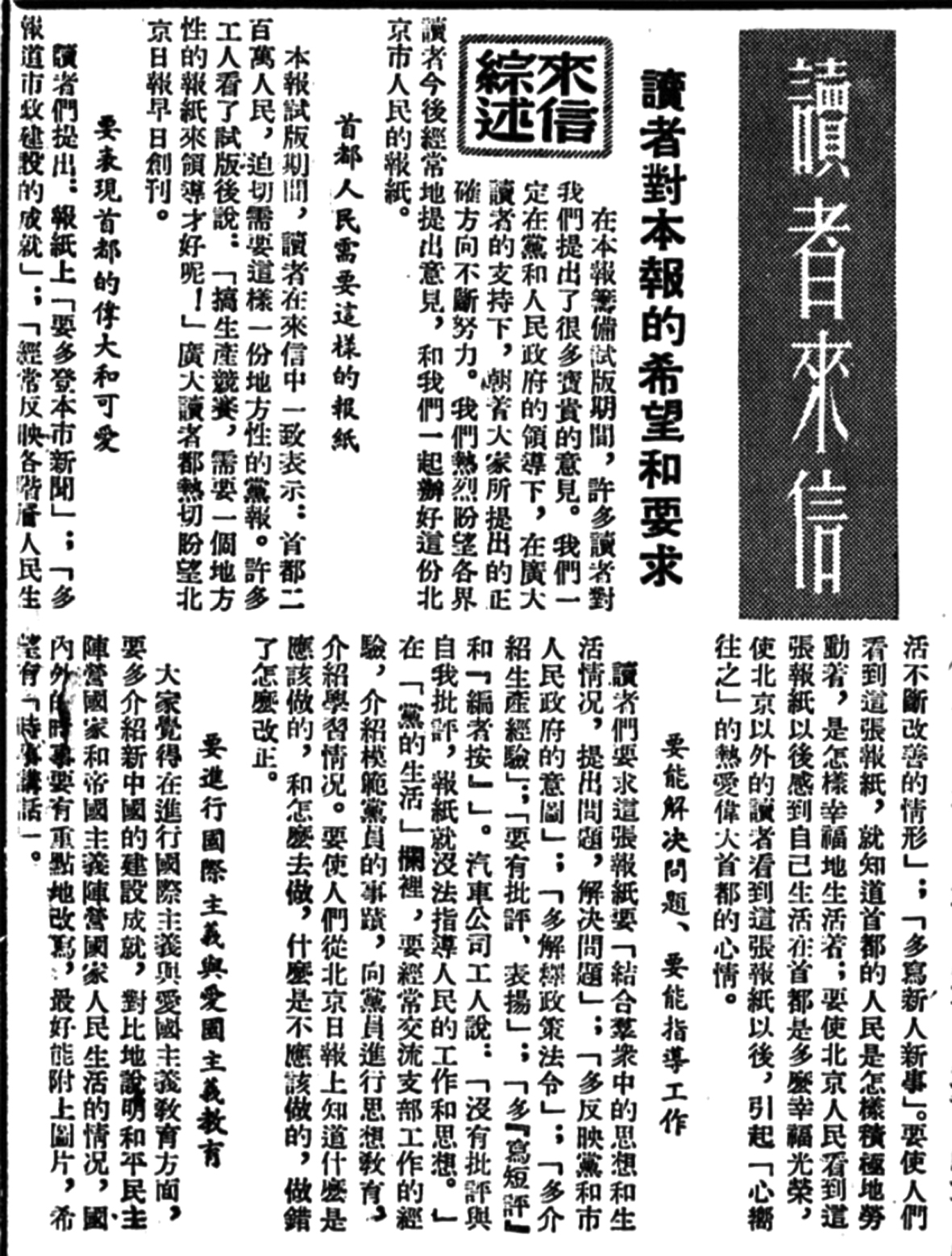 3月26日,《北京日报》头版发表社论《让更多的孩子戴上红领巾》,指出要破除旧思想,不能只把老老实实、规规矩矩的儿童当成好孩子,而将勇敢大胆、敢说话敢提问的孩子当成问题儿童。二版刊登时任北京市教育局副局长孙国梁的文章《进一步改造思想,树立社会主义的教育观点》,探讨如何正确培养教育少年儿童。