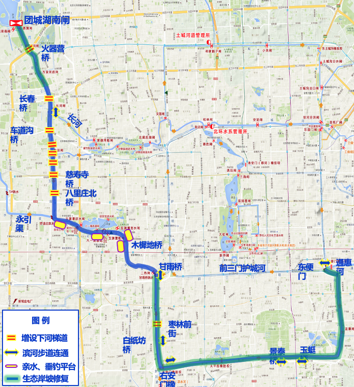 同时,将通过修建栈桥、明挖方涵等方式,打通长河口、甘雨桥、白纸坊桥、右安门橡胶坝左岸、景泰立交北跨河桥右岸、玉蜓立交北跨河桥右岸、通惠河汇合口左岸等7处滨河步道不通节点。