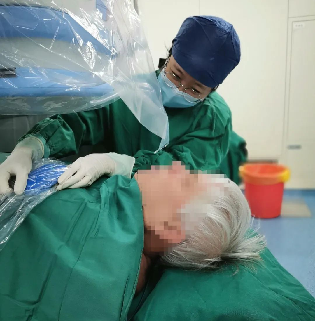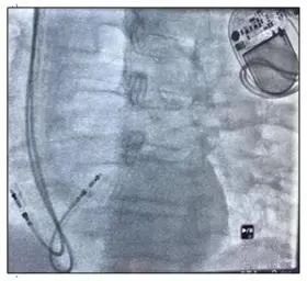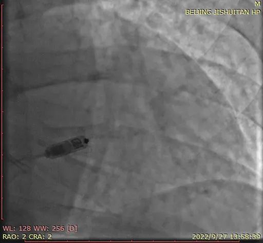 在积水潭医院介入中心护士、起搏器技师、监护室医师、心内科医师的共同合作下,患者在局麻下实施了MICRA无导线起搏器植入术。术中,刘巍主任团队通过股静脉穿刺顺利将起搏器导管送到心腔内部,经过X线图像确定了起搏器释放位置。尽管患者肥胖体型和心腔结构变化给植入部位定位带来了较大困难,但刘巍主任团队通过多体位、右心室内充分造影指示,成功将无导线起搏器固定于右心腔内。整个手术过程仅用30分钟,随后的起搏器调试也提示起搏器工作良好。