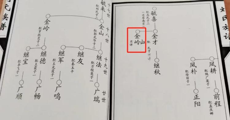 图为刘氏族谱,其中红框部分为1945年牺牲的烈士刘金山,由于该支长期失联,且族中老人记忆模糊,在修族谱时,以刘金岭之名入谱。(受访者供图)