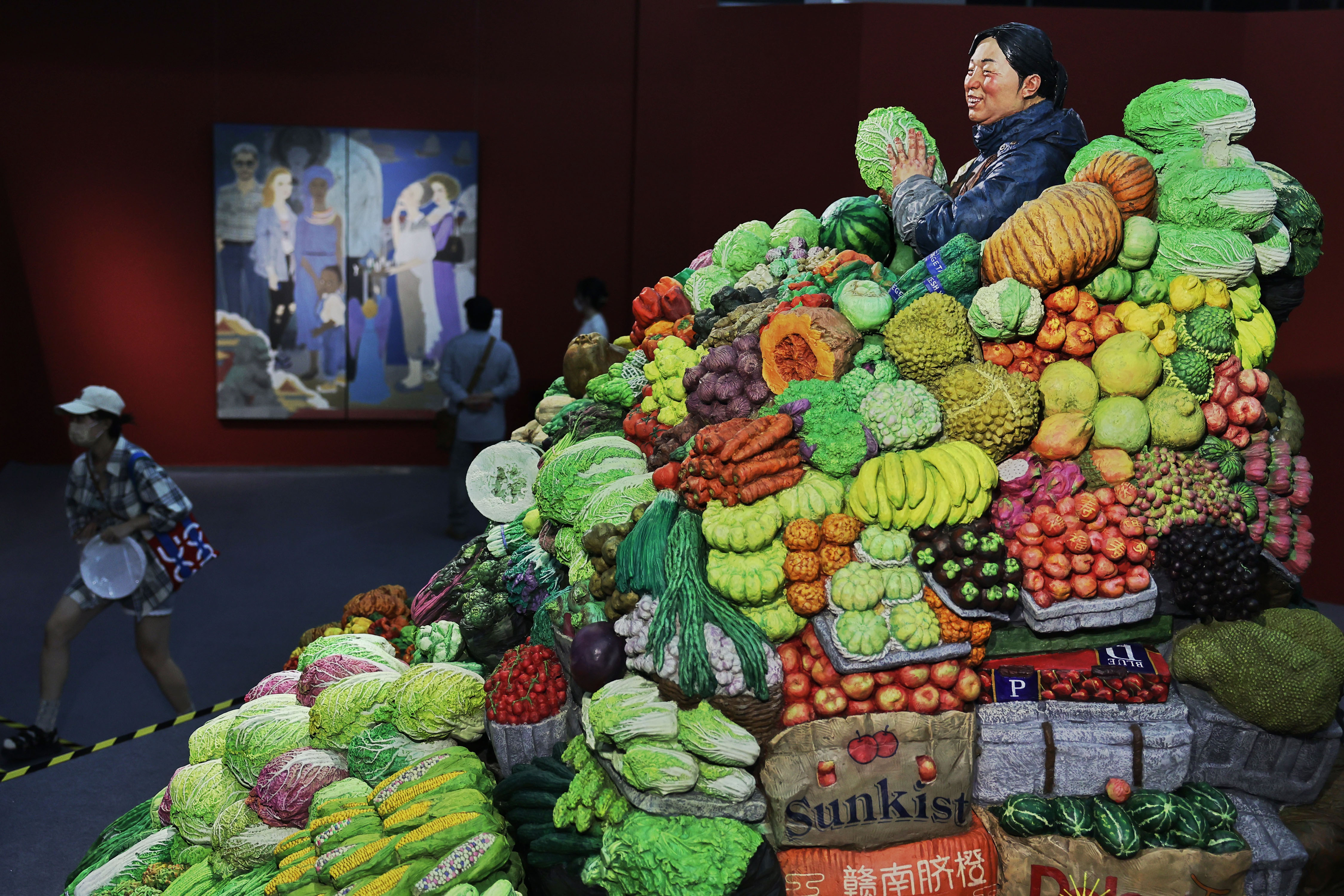 展厅中央,艺术家柳青的大型雕塑作品《成果2018》惟妙惟肖地刻画了一座“蔬菜之山”,一位农民满怀丰收的喜悦,手持一棵饱满的大白菜。一旁的雕塑《快递!快递!》展现了快递小哥在城市中穿梭的场景,艺术家以夸张手法表现如山堆积的货物,传达出对平凡劳动者的歌颂。