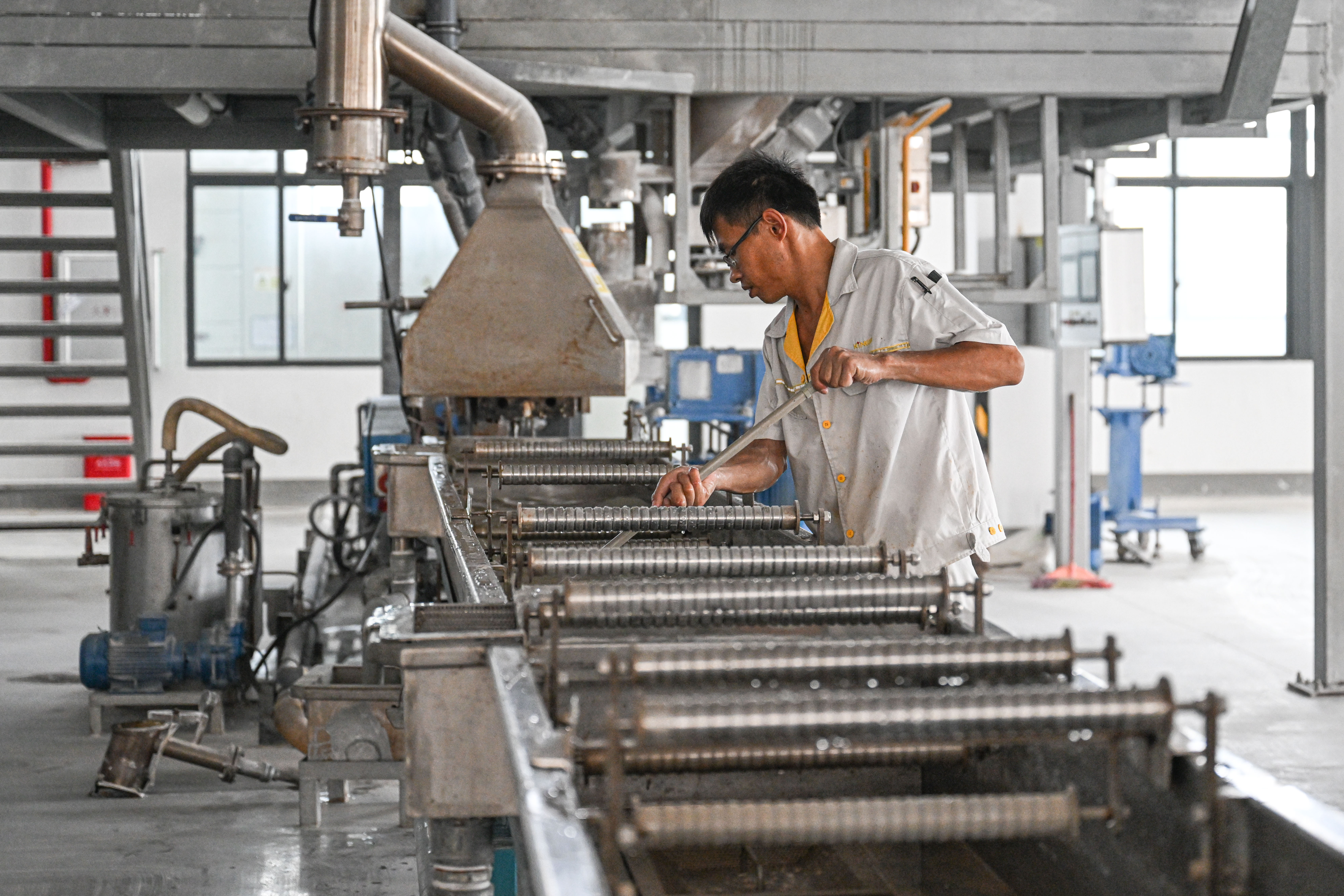 工作人员在位于海南洋浦保税港区的海南金发科技有限公司车间清理设备(9月28日摄)。新华社记者 蒲晓旭 摄
