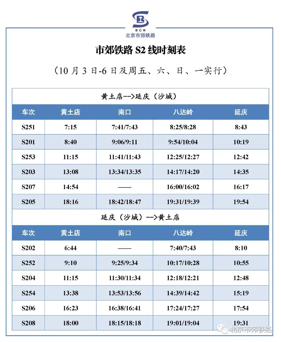 根据铁路运输调整通知,自2022年10月3日起至另有通知时止,市郊铁路S2线S287/S288次(黄土店站~沙城站)临时停运,列车运行时刻表如下: