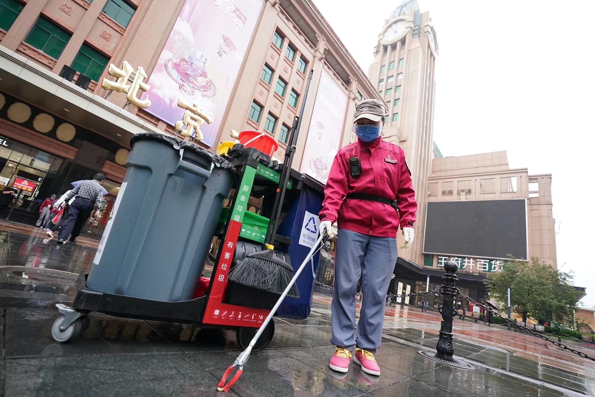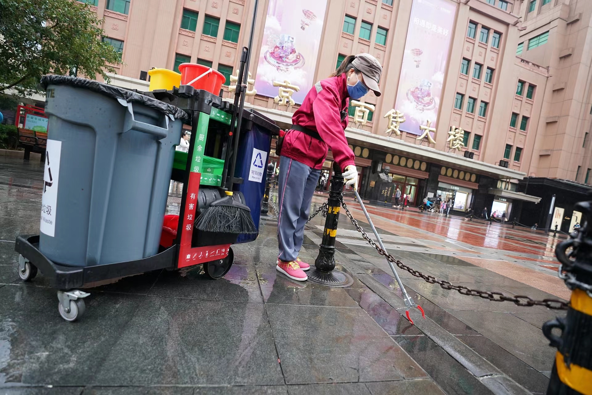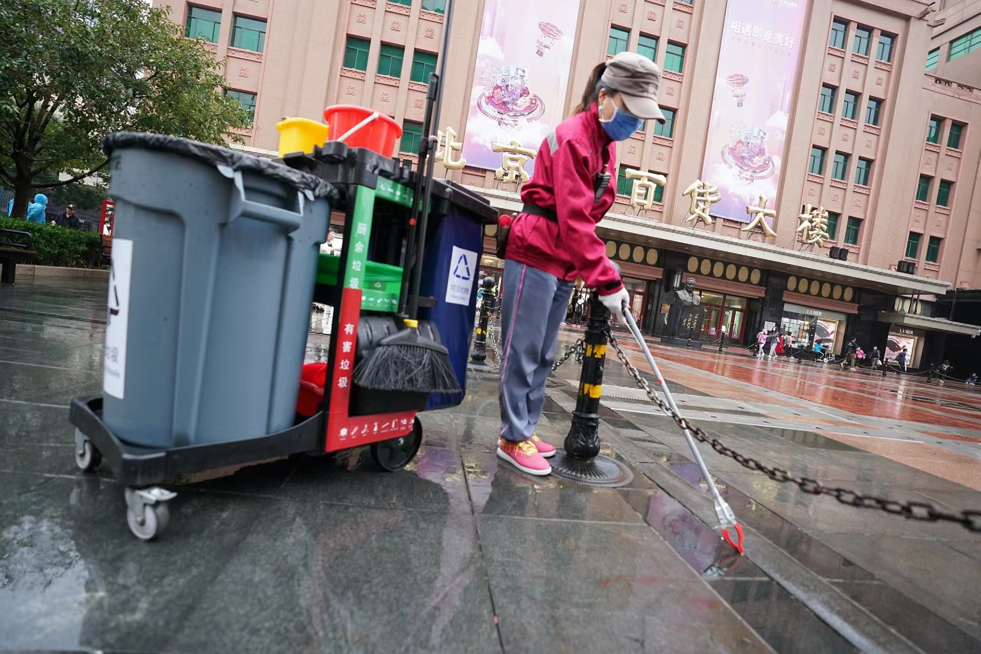 今天早上不到7点,蒙蒙细雨中,东城环卫中心王府井环卫所保洁员徐俊红推着移动保洁车来到王府井百货大楼前,这里是她负责的网格区域。考虑到假期王府井大街的客流量比较大,徐俊红和同事们的到岗时间比平时提前了一个小时。