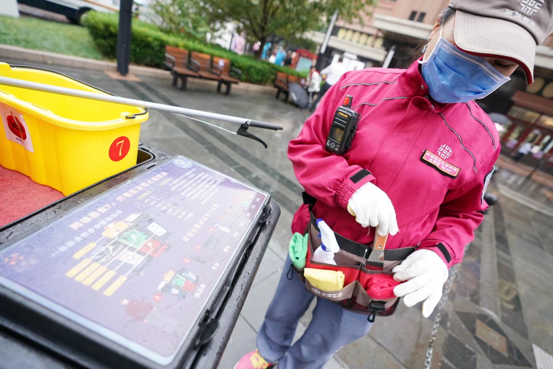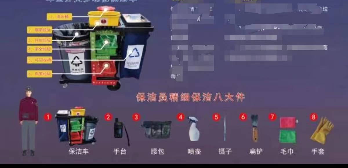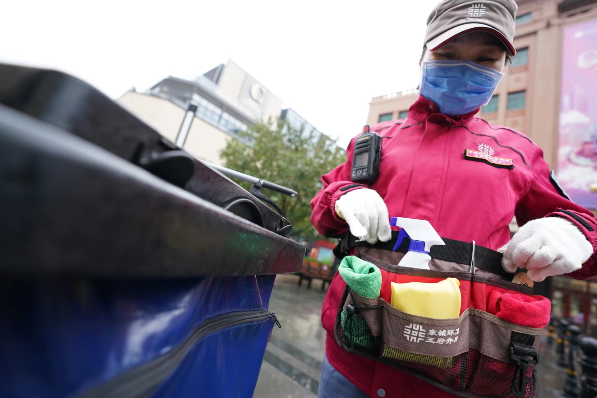 双色毛巾、镊子、扁铲、喷壶……徐俊红的小腰包仿佛一个“百宝袋”,不一会儿就拿出了好几样保洁工具。“我们这 ‘八大件’各有各的用处,就是为了满足精细化保洁的需求!”徐俊红说着,给记者挨个讲解起来。胶皮手套是进行擦拭作业时专用的;红色毛巾用来擦拭灯杆、花坛等设施;绿色毛巾专门擦拭座椅;镊子用来夹缝隙里的杂物;铲子用来铲路面上不易清除的口香糖;一把小喷壶装着稀释好的清洁剂;手台随时呼叫、沟通;腰包把这些装备一收,便于随身携带。改装后的移动保洁车有“四分类”垃圾箱,取代了王府井大街上原有的固定垃圾桶,还成为了保洁作业的“移动指挥部”。保洁员也身兼垃圾分类指导员的职责,引导市民、游客正确分类的同时,也对投放错的垃圾进行二次分拣。