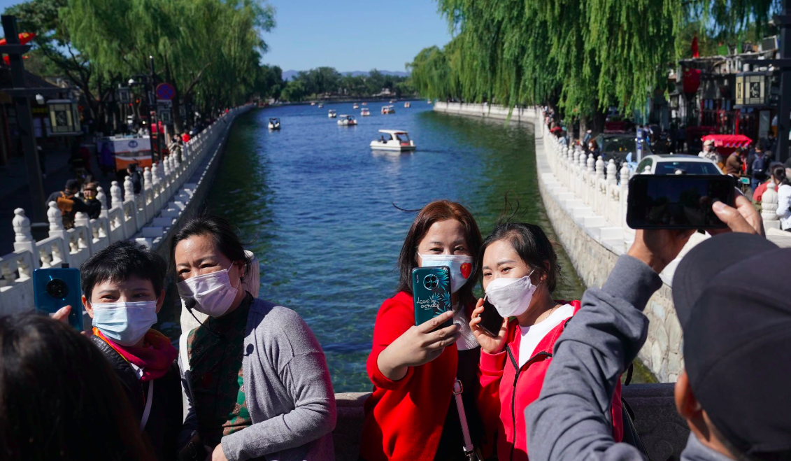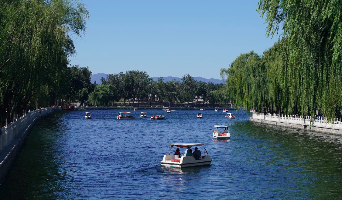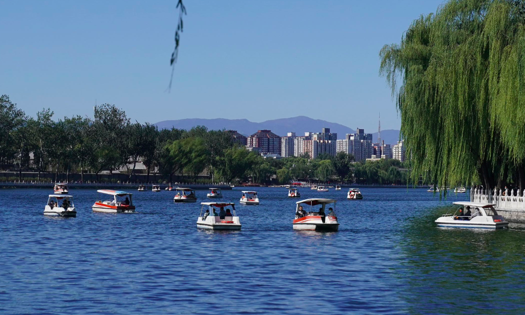 10月4日,经过一场秋雨洗礼的京城迎来了晴天碧日的天气,空气格外清新、通透,站在什刹海银锭桥头西望,碧波倒映着绿柳,一叶叶扁舟点缀其间,远处的群山依稀掩映,构成一幅美妙的金秋画卷,游客掏出手机在银锭桥头纷纷留下“银锭观山”美景。