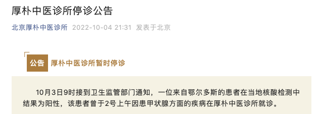 据北京厚朴中医诊所10月4日晚通报,10月3日9时接到卫生监管部门通知,一位来自鄂尔多斯的患者在当地核酸检测中结果为阳性,该患者曾于2号上午因患甲状腺方面的疾病在厚朴中医诊所就诊。