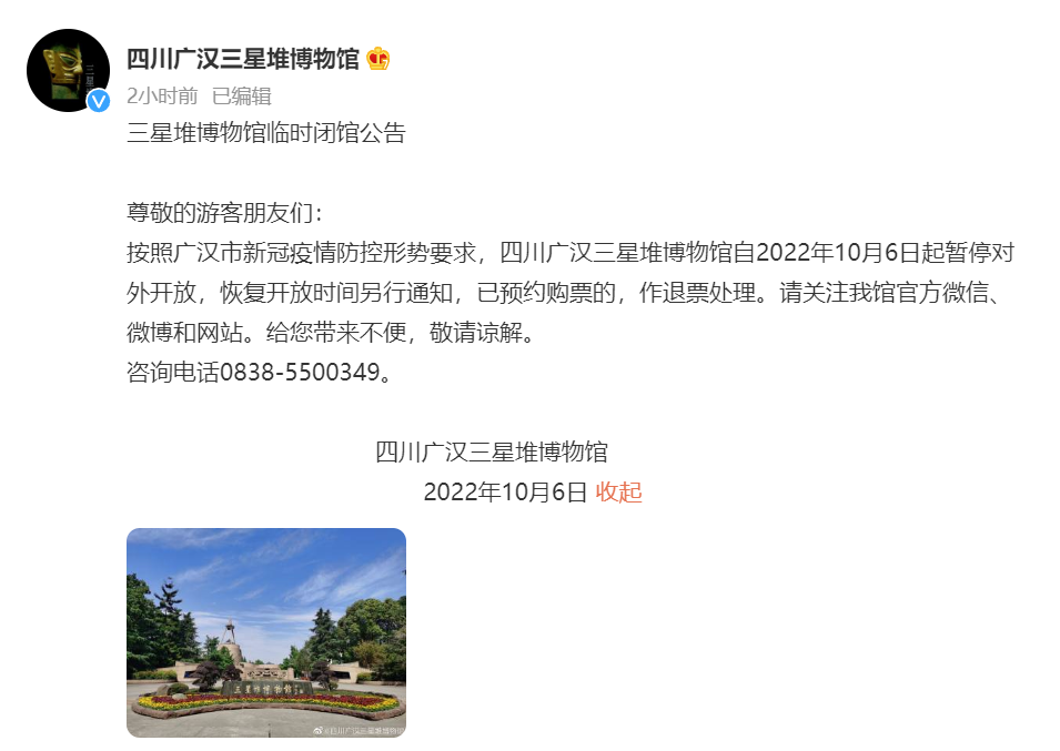 按照广汉市新冠疫情防控形势要求,四川广汉三星堆博物馆自2022年10月6日起暂停对外开放,恢复开放时间另行通知,已预约购票的,作退票处理。请关注我馆官方微信、微博和网站。给您带来不便,敬请谅解。咨询电话0838-5500349。