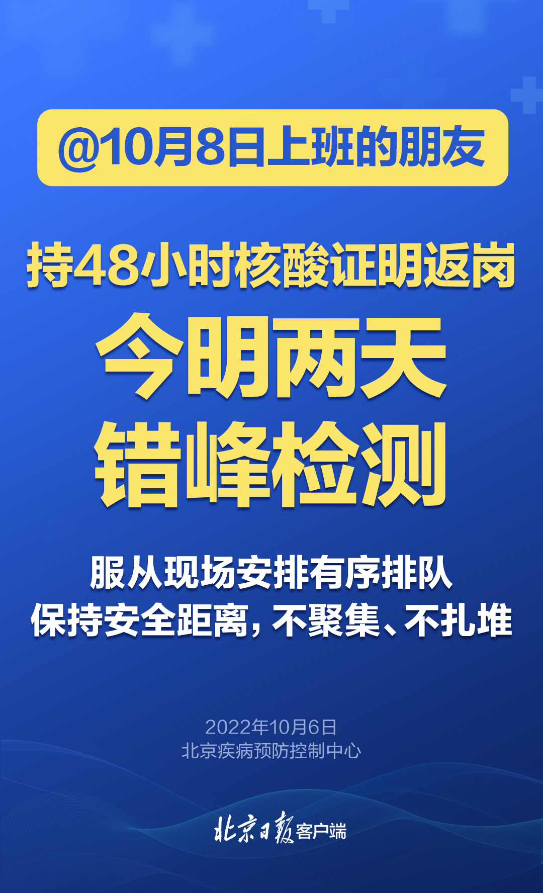 提醒10月8日返岗上班的市民朋友,须持48小时核酸阴性证明返岗上班,今明两天错峰进行核酸检测,服从现场安排,有序排队,正确佩戴口罩,保持安全距离,不聚集、不扎堆、少交谈,检测后戴好口罩立即离开,做好手卫生。