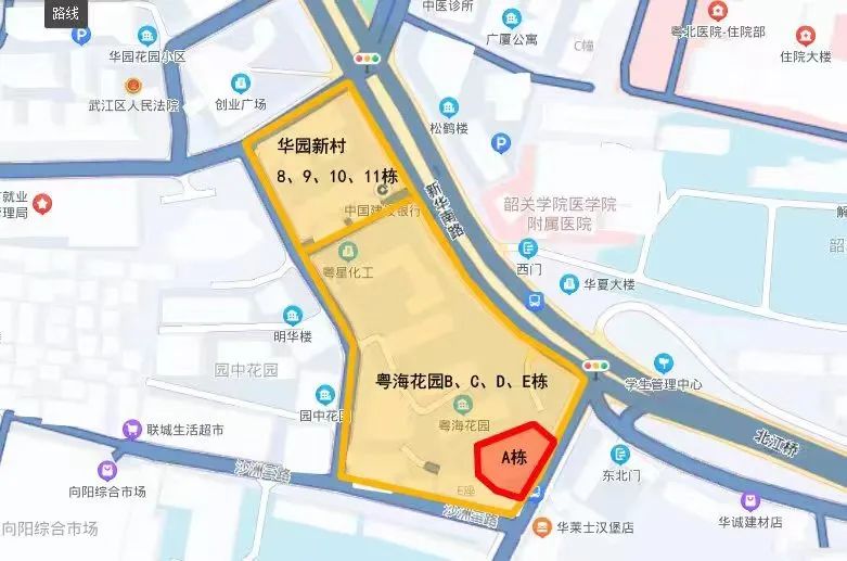 自2022年10月7日6时起,武江区新华街道沙洲尾粤海花园A栋调整为高风险区,粤海花园B、C、D、E栋,华园新村8、9、10、11栋调整为中风险区(见附图)。