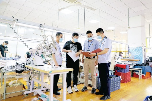 福建省厦门市翔安区纪委监委联合区税务局走访辖区外贸企业,确保税费支持政策落实落地。图为近日,该区纪检监察干部在某服装出口企业了解相关政策落实情况。 颜妍 摄