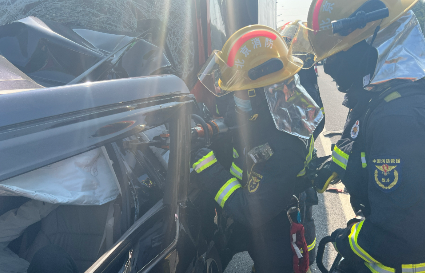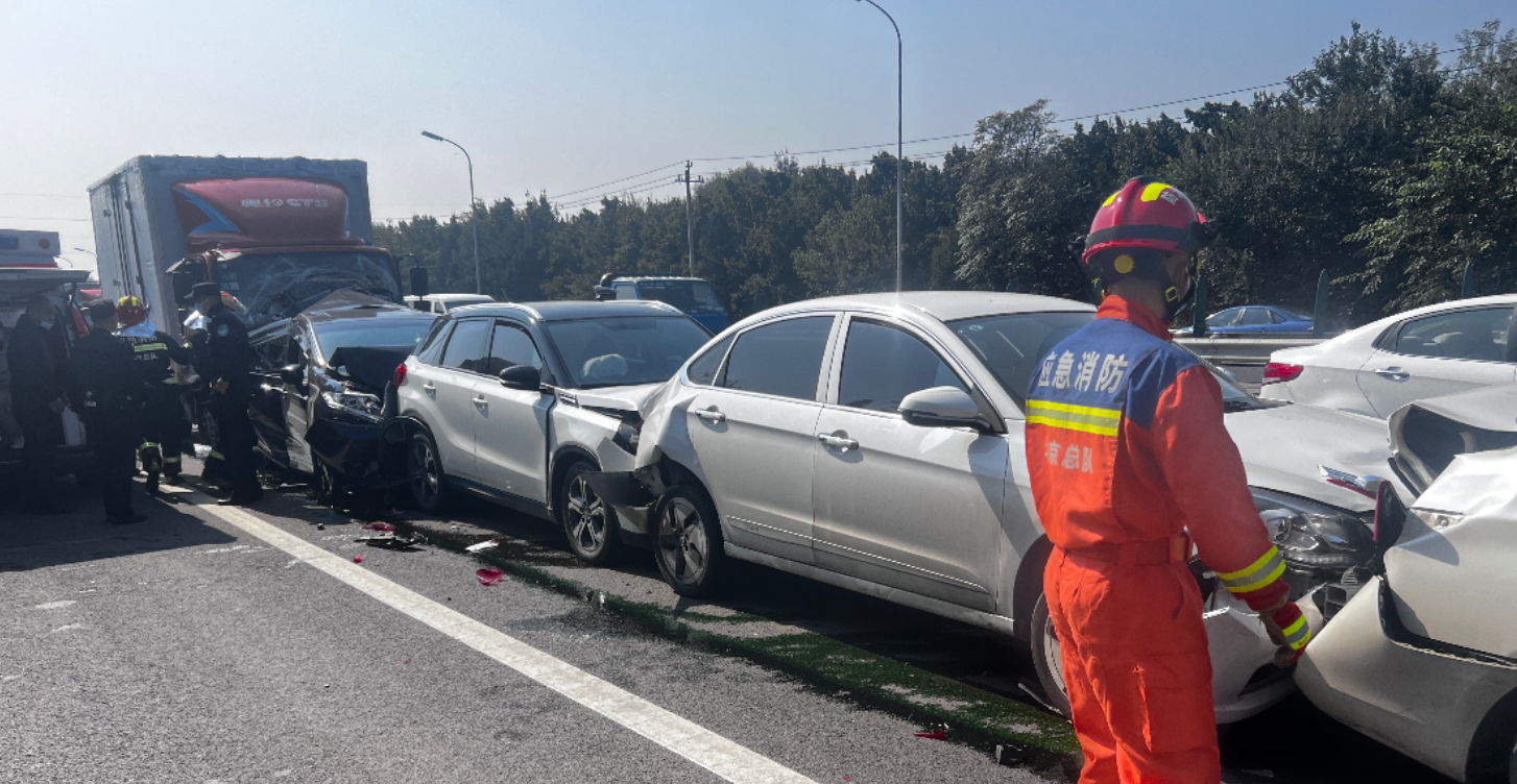10月7日上午11时12分,海淀区消防救援支队香山消防救援站接到报警,北五环香山出口由南向北方向发生八车追尾事故,现场有2名人员被困车内,情况紧急。香山消防救援站立刻按照指挥中心调度出动2车14人前往事故现场。