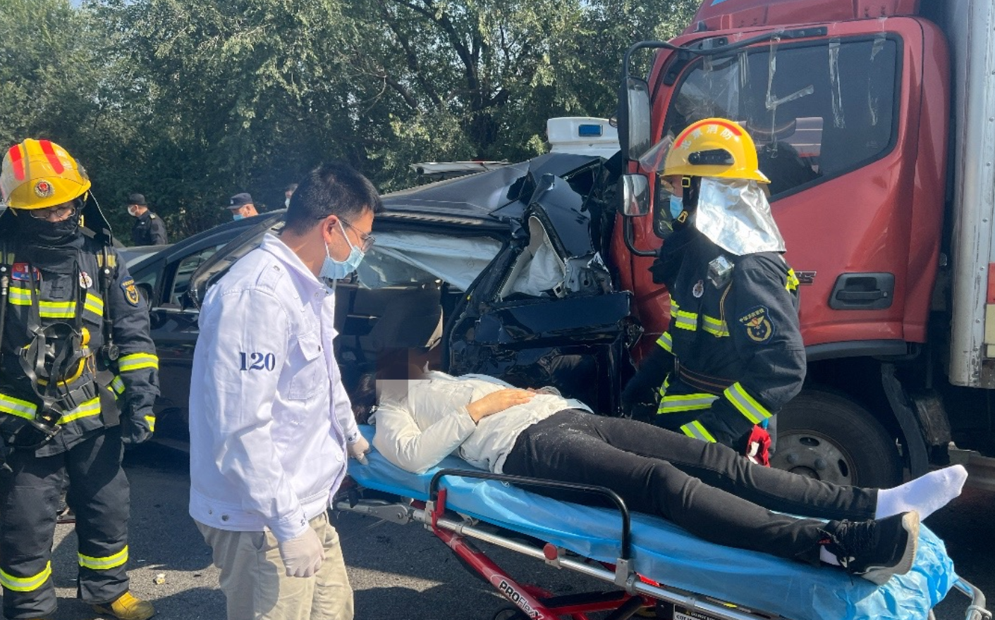 3分钟后,2名被困人员相继被救出,经现场120医务人员确认,被困人员因车辆碰撞受伤但无生命危险,救援人员将现场交接民警,消防救援人员返回。