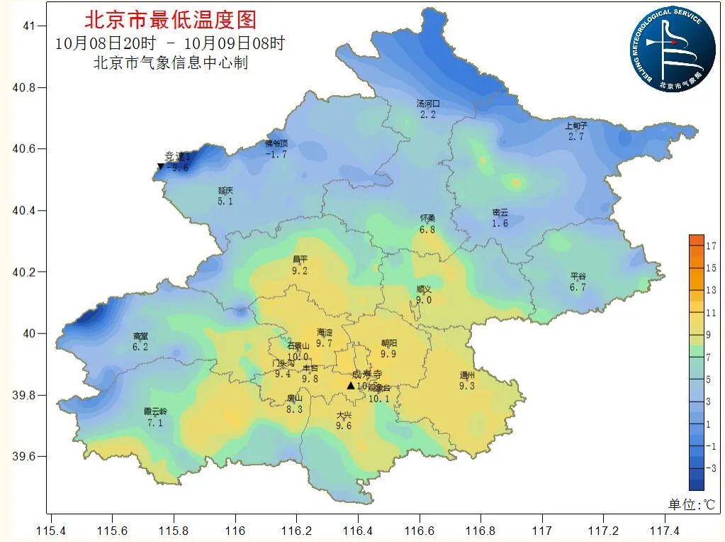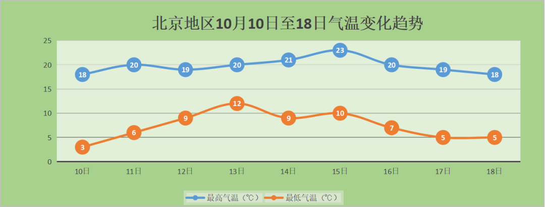 预计南郊观象台10月10日至18日最高气温18~23℃,最低气温3~12℃。