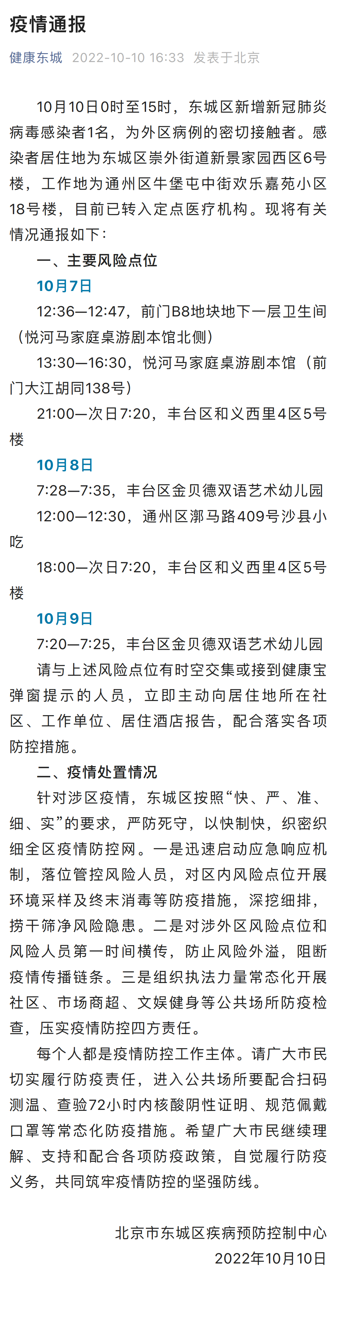 10月10日0时至15时,东城区新增新冠肺炎病毒感染者1名,为外区病例的密切接触者。感染者居住地为东城区崇外街道新景家园西区6号楼,工作地为通州区牛堡屯中街欢乐嘉苑小区18号楼,目前已转入定点医疗机构。现将有关情况通报如下: