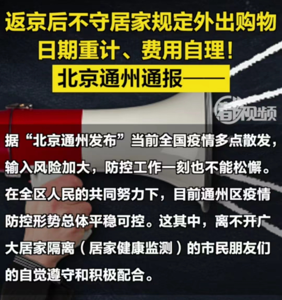 返京后签订了告知书,却在落实居家健康监测期间私自外出,给疫情防控带来了传播风险。10月10日,通州区通报了5起居家监测期间违规外出的典型案例。通运街道孙某某、永顺镇唐某某、马驹桥镇计某某等相关人员已一律按照所签订的居家承诺书,转送集中隔离或居店健康监测,日期重新计算,费用自理。